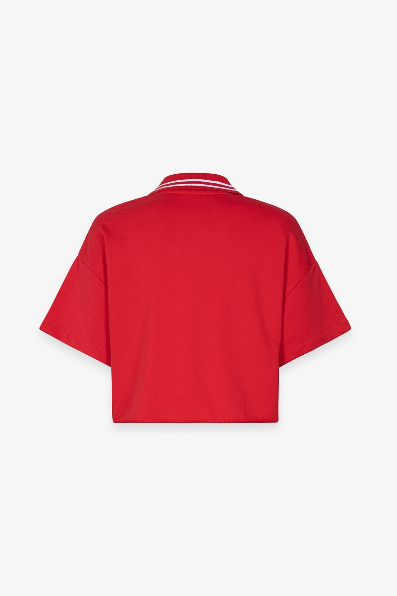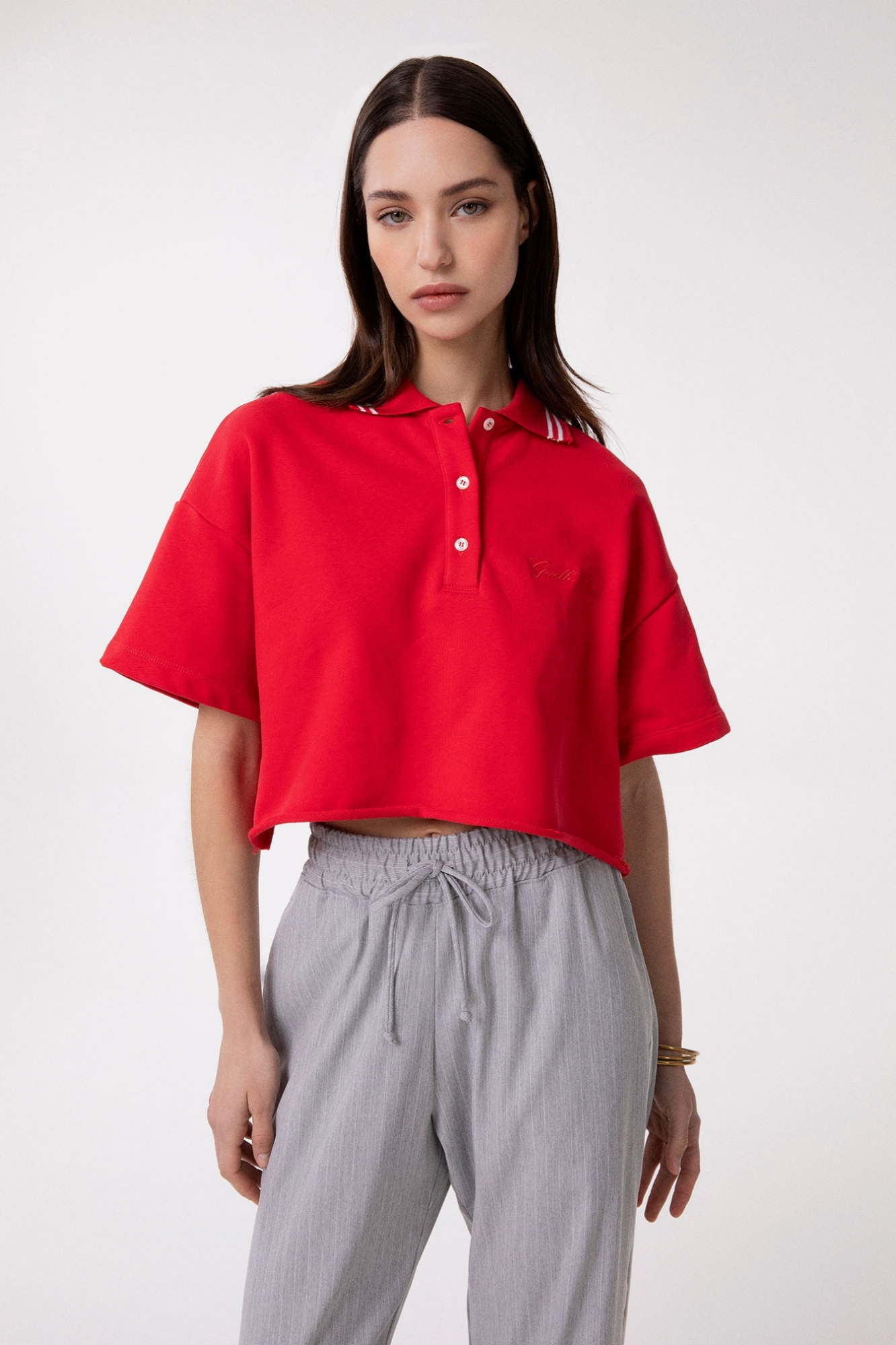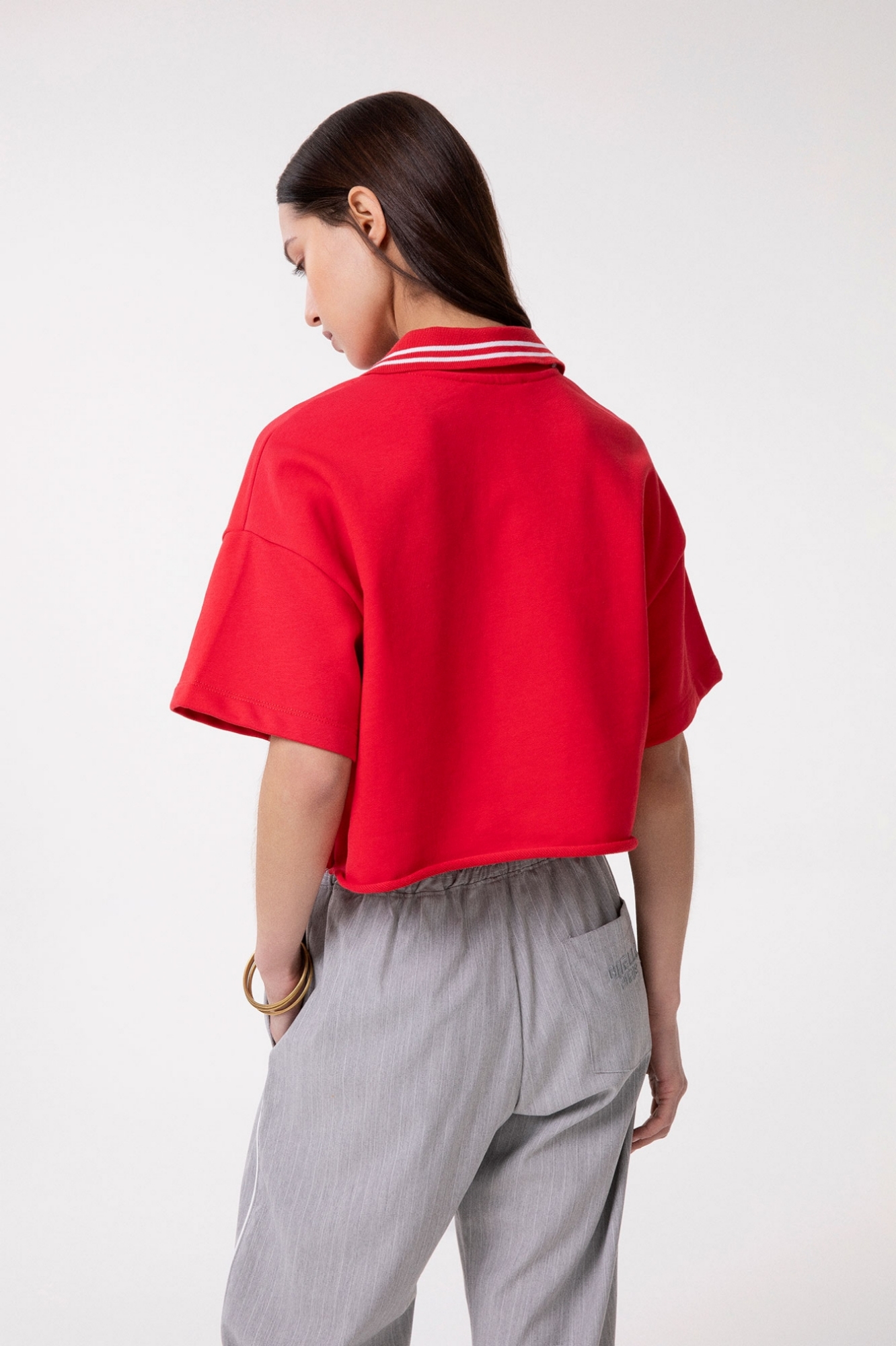 Half-sleeved polo shirt with knitted collar and heart-side embroidery