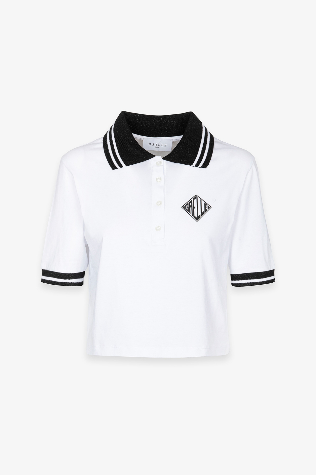 Half-sleeved crop T-shirt with polo collar and button placket, heart-shaped heat-appliqué