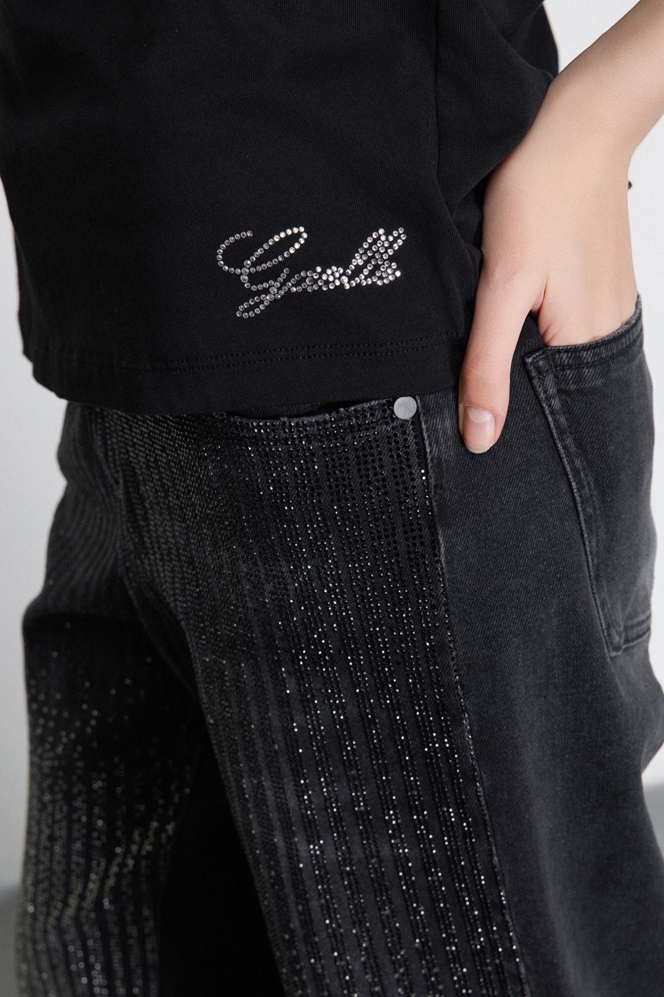 T-Shirt Paricollo Mezza Manica Con Inserto In Pizzo Nero Personal. Strass