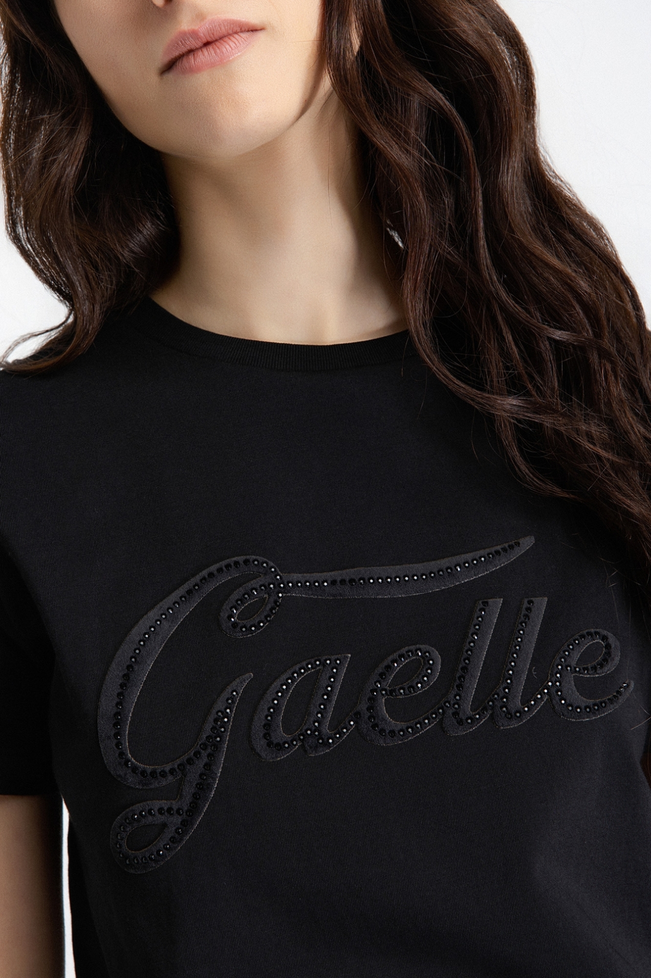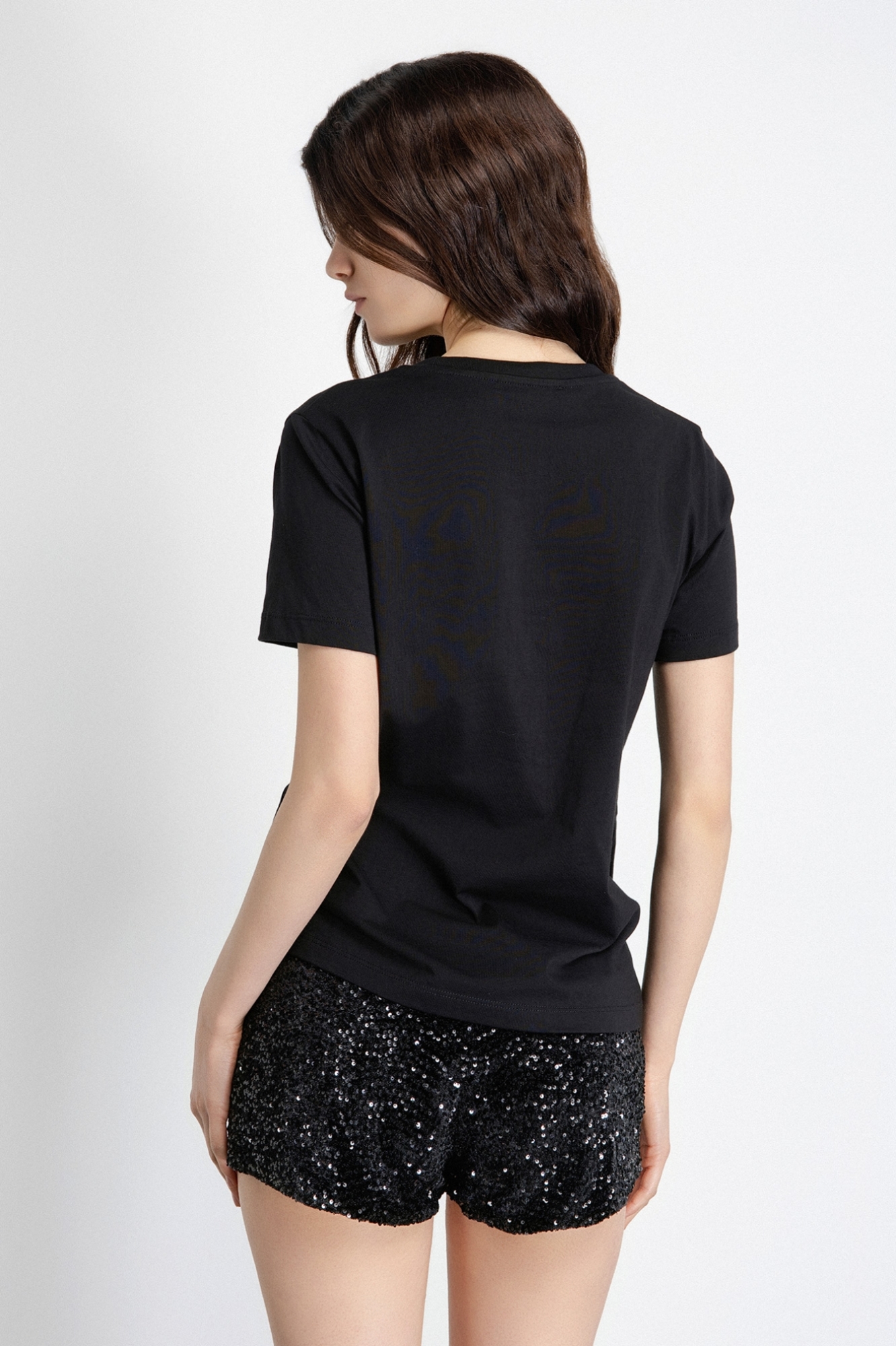 T-Shirt Paricollo Mezza Manica Con Personalizzazione In Ciniglia E Strass Termo Neri